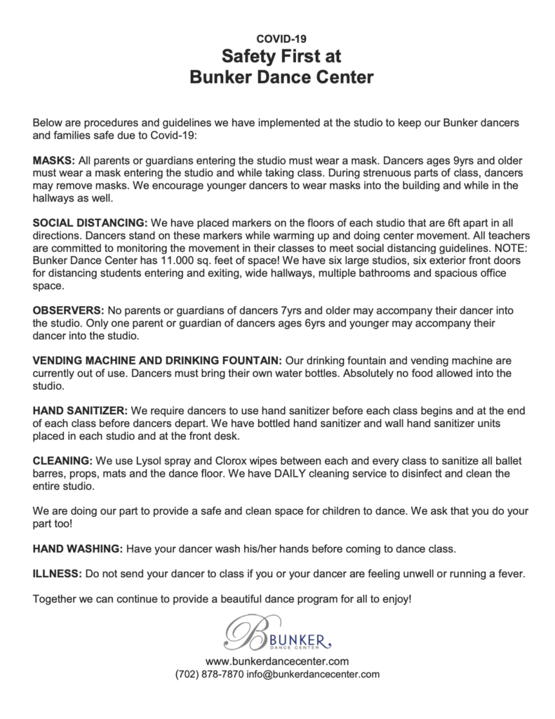 We understand that you have questions about our return to dancing and training considerations due to Covid-19. Questions like, “are dance studios open? Is it safe for my child to attend dance class during COVID? Is it safe to dance with a mask on?” There is nothing we value more than the health and safety of the Bunker Dance Center family. With careful consideration, we have established strict protocol to ensure that our dancers, teachers and staff are doing everything we can to ensure safe social distance dance classes in our Bunker Dance and Las Vegas community.